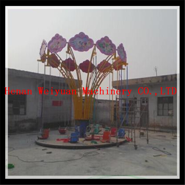 Mini flying chair for children, physical, mental and courage in the development, while the emergence of mini boats chair will exercise the courage to provide children with a platform to run as a kind of mini- boats chair was thrown time feeling and accompanied by a brief sensation of weightlessness , children can develop courage ; Furthermore mini Dumbo chair is manufactured according to rotate outward pull, let fly and ride the chair lift off from the ground , which contains the three forces balanced relationship ( tension, rejection of force, weight ) ; mini boats have been able to balance the rotating chair , do not rely on the intermediate tray support force, but by the tension around each seat to keep the balance . This knowledge can be explained by parents to their children , so that they develop intellectually .